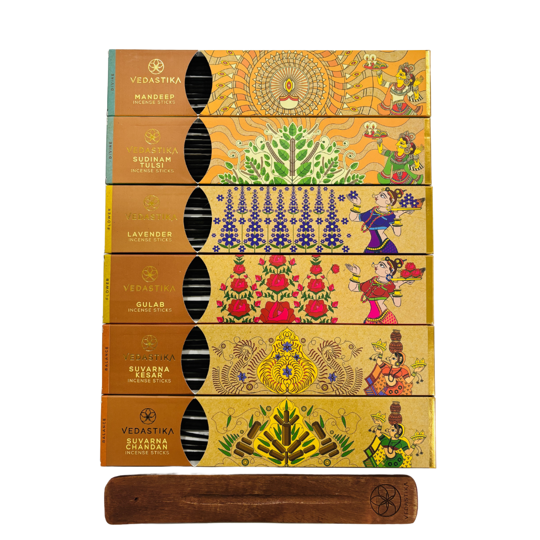 VEDASTIKA Healing Collection Premium Fragrance Long-Lasting Charcoal Free 140 Incense Sticks Non-Allergic Handmade Agarbatti for Pooja & Meditation with Burner Stand_Pack of 7