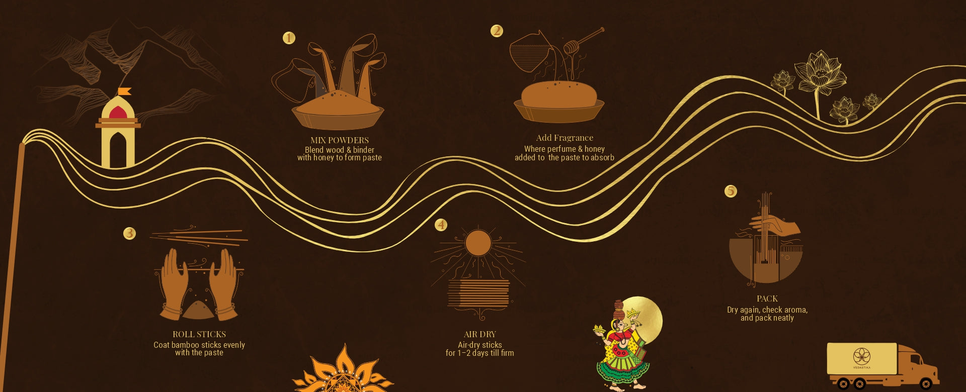 Handmade incense sticks are crafted through a slow, mindful process β blending, rolling, drying, and packing each stick by hand.