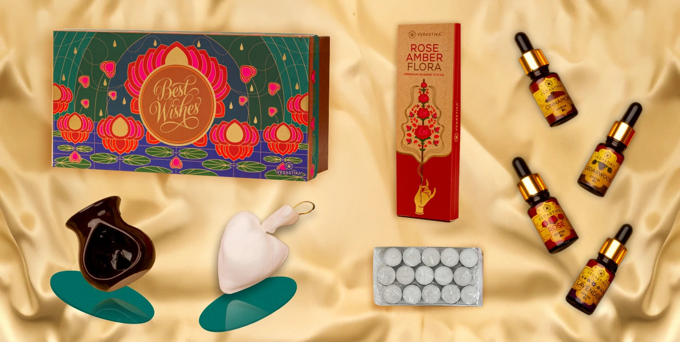 Bring calm and luxury home with the Aroma Hamper, including a ceramic diffuser, aroma oils, camphor cones, and tea lights. A perfect mix of modern aesthetics and traditional aromatherapy for mindful living.