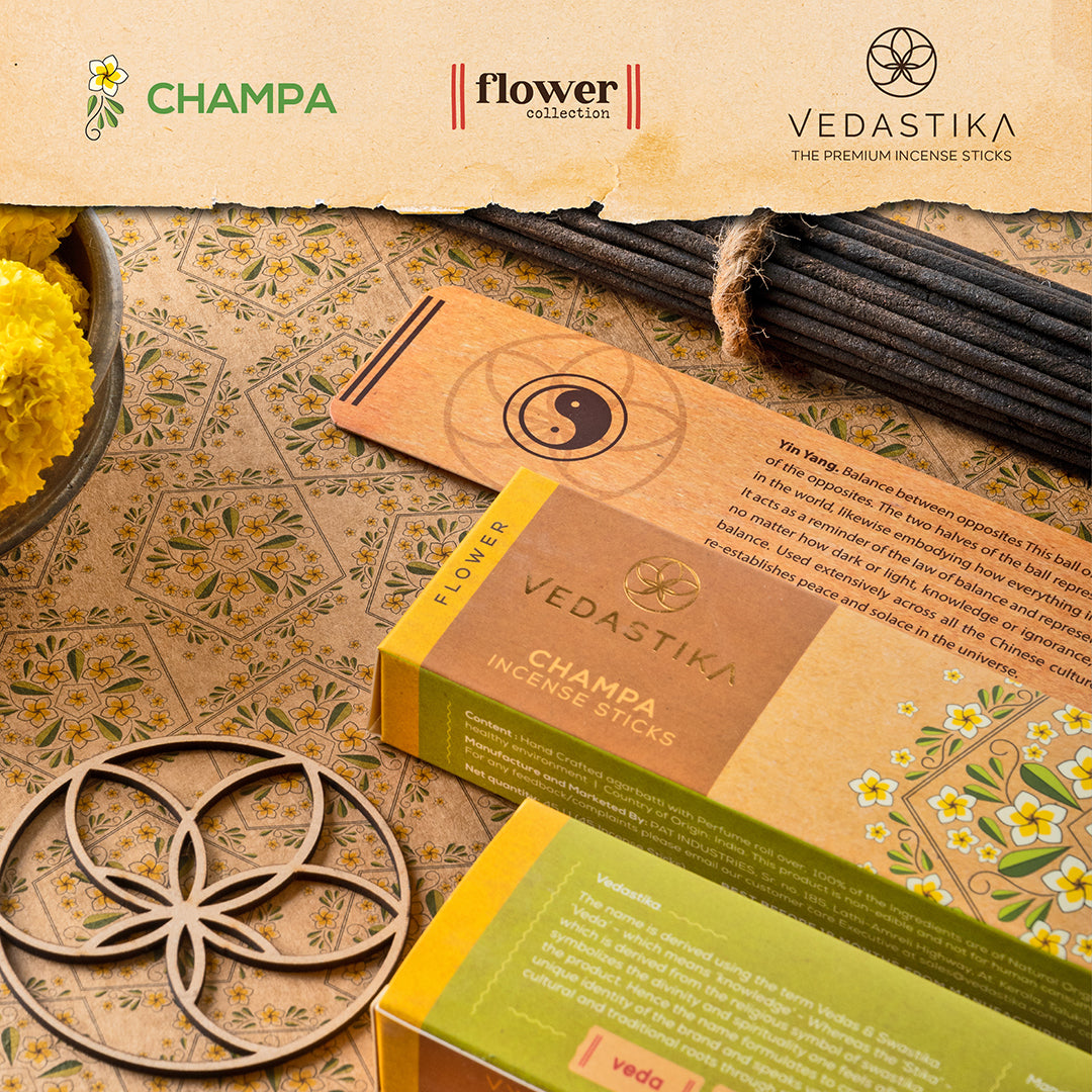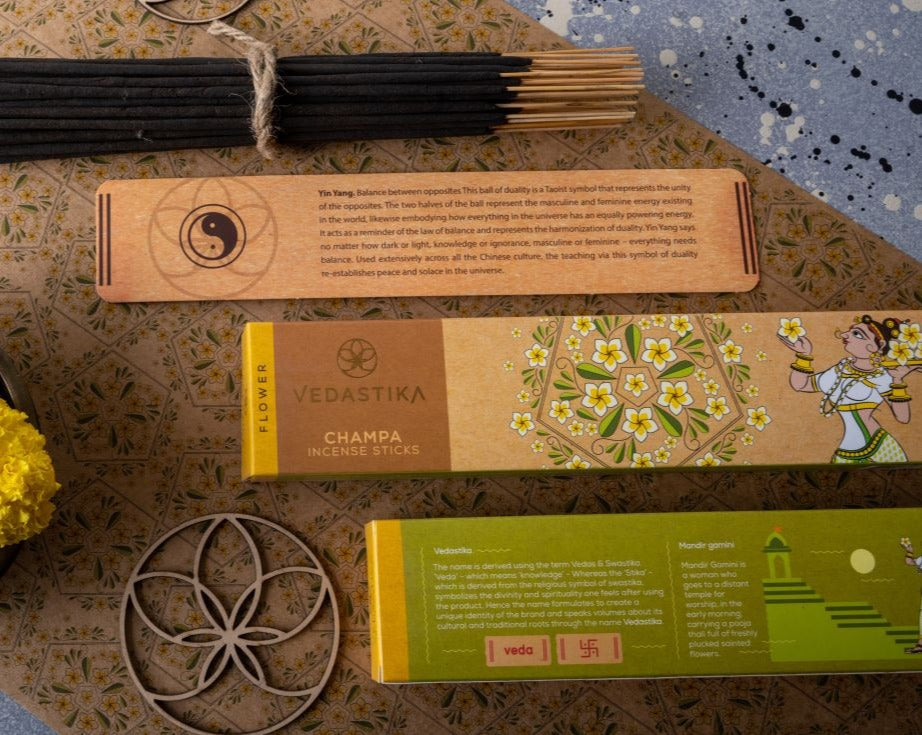 1. Spiritual Connection: The incense sticks are presented as a means to connect with the spiritual world, drawing from the ancient roots and wisdom of the Vedas, which means "knowledge." The use of the Swastika symbol adds to the religious and cultural significance.