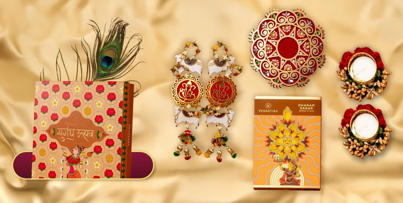Each Decor Delight Hamper includes torans, rangolis, decorative candles, incense, and morpankh — crafted to elevate festive décor. A perfect blend of beauty and divinity, bringing fragrance and light to every celebration.