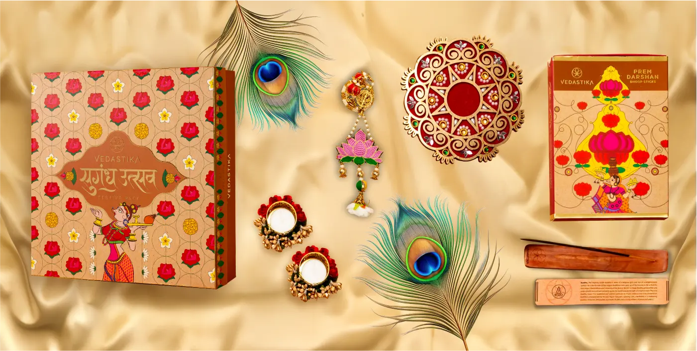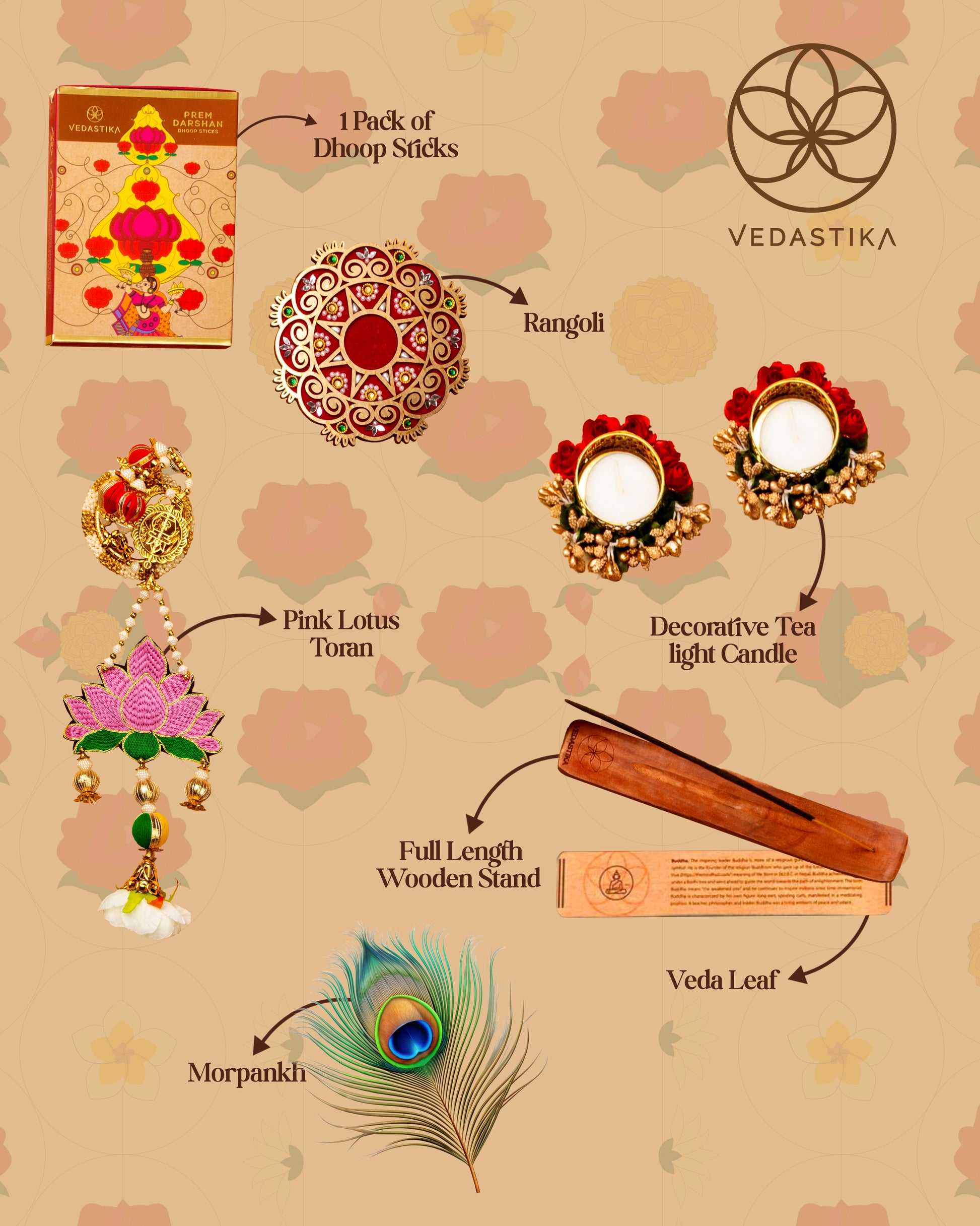 Each Decor Delight Hamper includes torans, rangolis, decorative candles, incense, and morpankh — crafted to elevate festive décor. A perfect blend of beauty and divinity, bringing fragrance and light to every celebration.