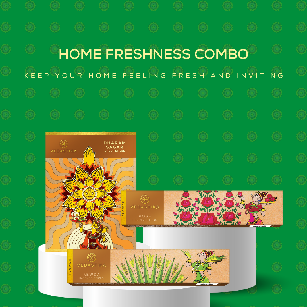 Description: Revitalize your living spaces with the "Home Freshness Bundle." This specially designed combo pack includes Rose, Kewda, and Dharm Sagar incense sticks, each chosen to infuse your home with refreshing and uplifting aromas.