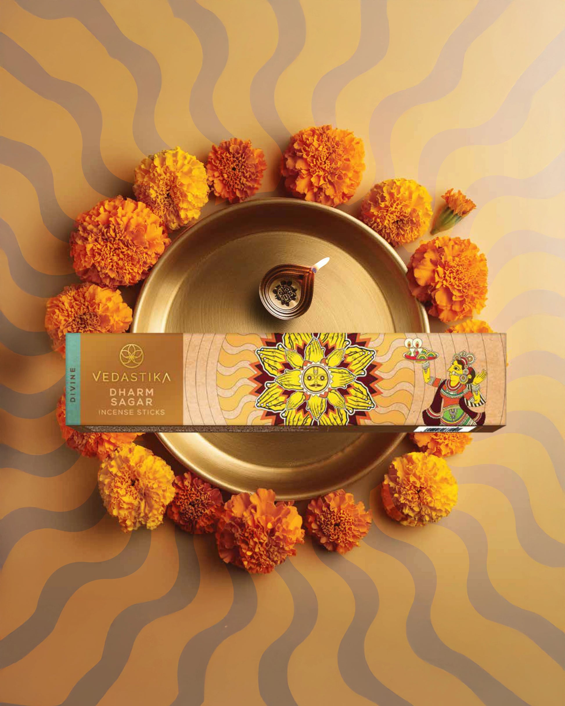 6. Mandir Gamini Concept: The packaging is inspired by the concept of "Mandir Gamini," reminiscent of ancient worship practices where a lady would visit the temple with freshly plucked flowers. This concept aims to evoke the essence of ancient rituals.