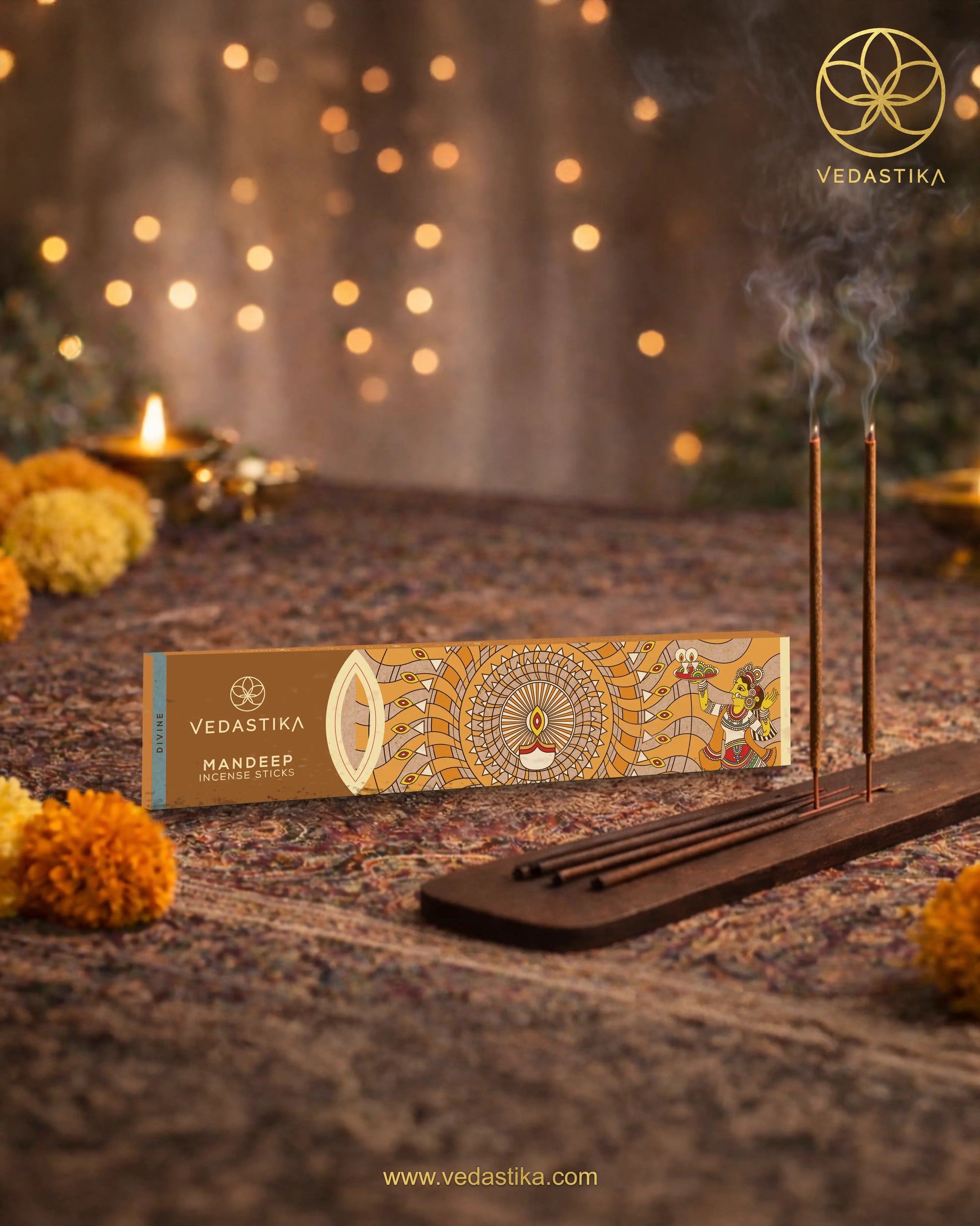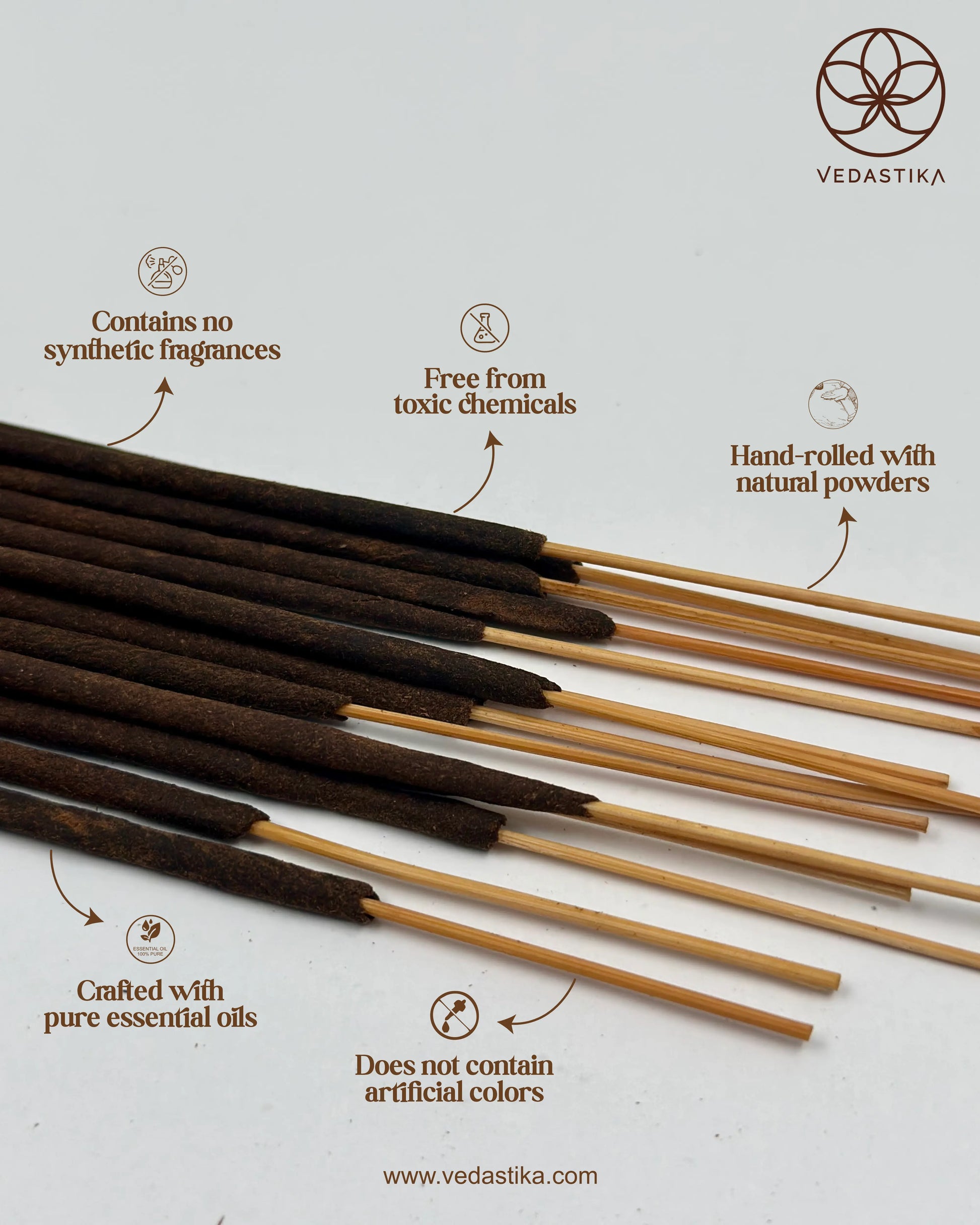 1. Spiritual Connection: The incense sticks are presented as a means to connect with the spiritual world, drawing from the ancient roots and wisdom of the Vedas, which means "knowledge." The use of the Swastika symbol adds to the religious and cultural significance.