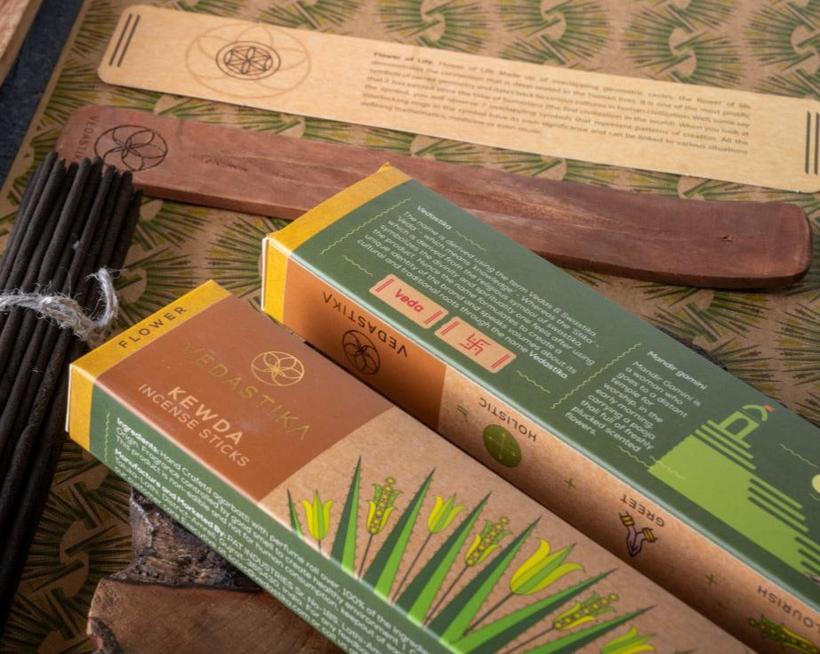 1. Spiritual Connection: The incense sticks are presented as a means to connect with the spiritual world, drawing from the ancient roots and wisdom of the Vedas, which means "knowledge." The use of the Swastika symbol adds to the religious and cultural significance.