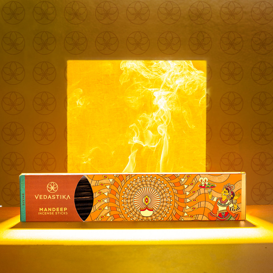 1. Spiritual Connection: The incense sticks are presented as a means to connect with the spiritual world, drawing from the ancient roots and wisdom of the Vedas, which means "knowledge." The use of the Swastika symbol adds to the religious and cultural significance.