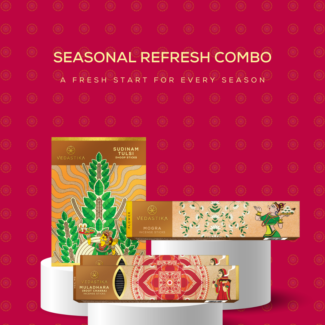 Description: Elevate your seasonal ambiance with the "Seasonal Refresh Pack." This thoughtfully curated set includes Mogra, Sudhinam Tulsi, and Muldhara incense sticks, each designed to bring freshness and grounding to your space throughout the year.