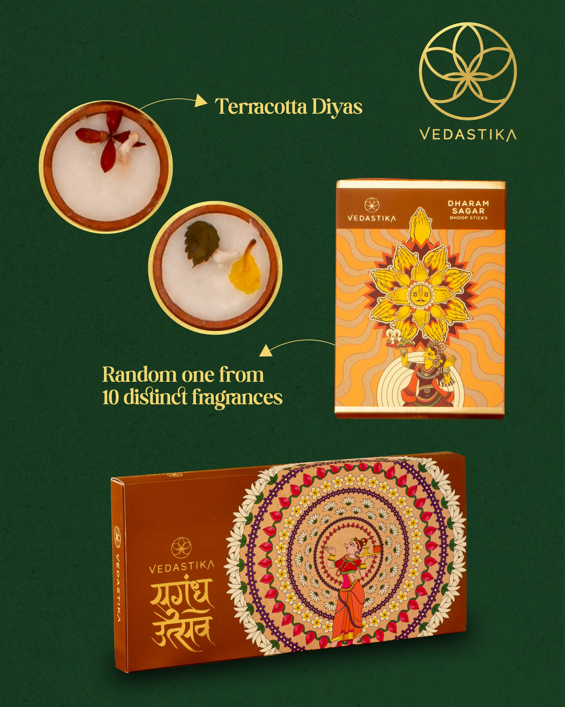 Celebrate artisanal beauty with our Small Handcrafted Hamper, which includes four terracotta diyas and a box of fragrant dhoop sticks. Each diya is handmade, spreading light, fragrance, and positivity throughout your home.