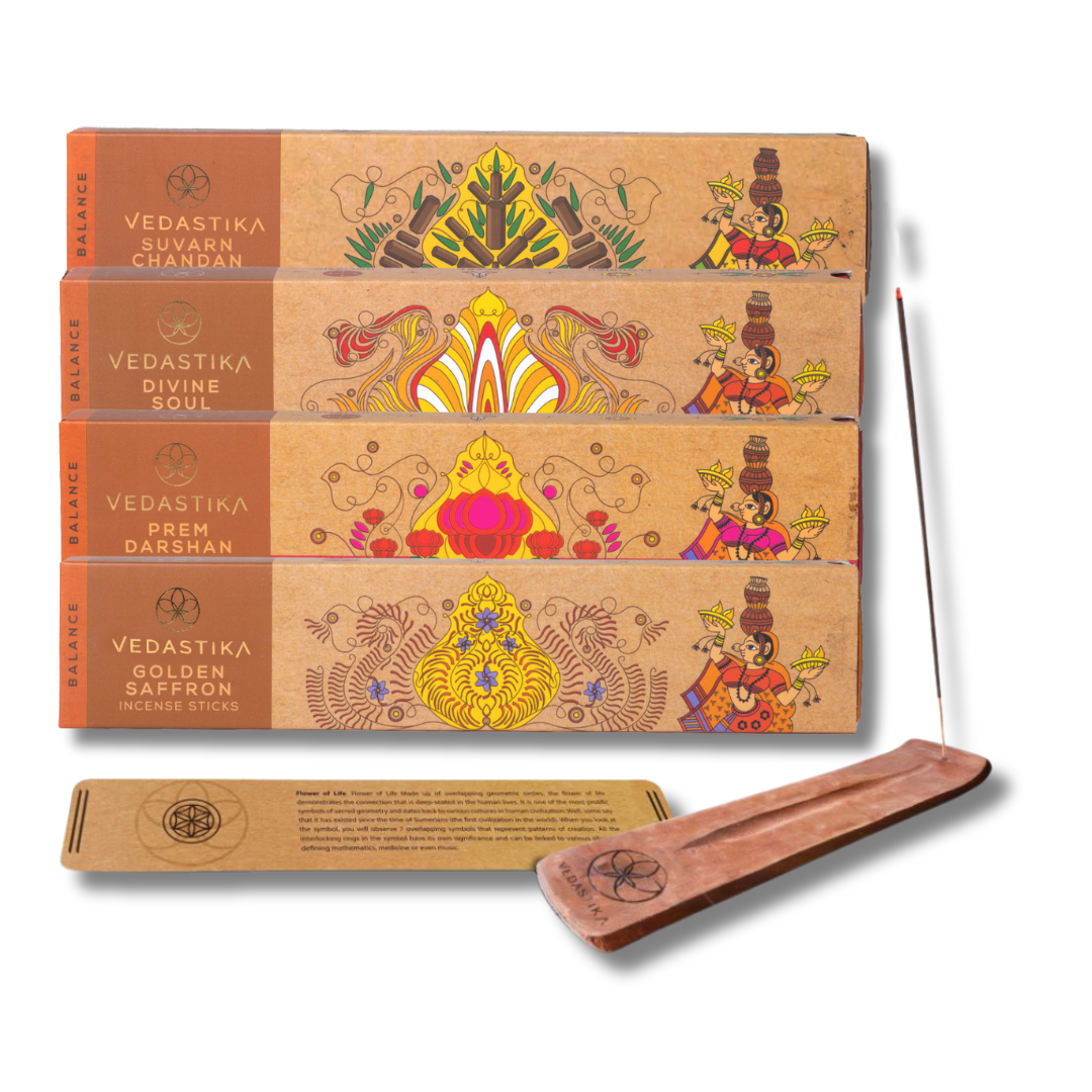 VEDASTIKA Balance and Serenity Premium Fragrance Hand Rolled Charcoal Free Agarbatti for Pooja with Burner Stand_Pack of 4