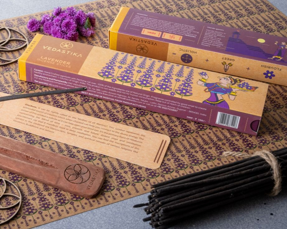 1. Spiritual Connection: The incense sticks are presented as a means to connect with the spiritual world, drawing from the ancient roots and wisdom of the Vedas, which means "knowledge." The use of the Swastika symbol adds to the religious and cultural significance.