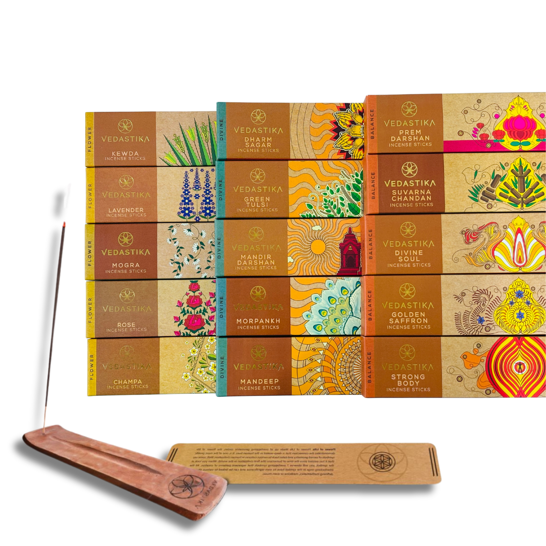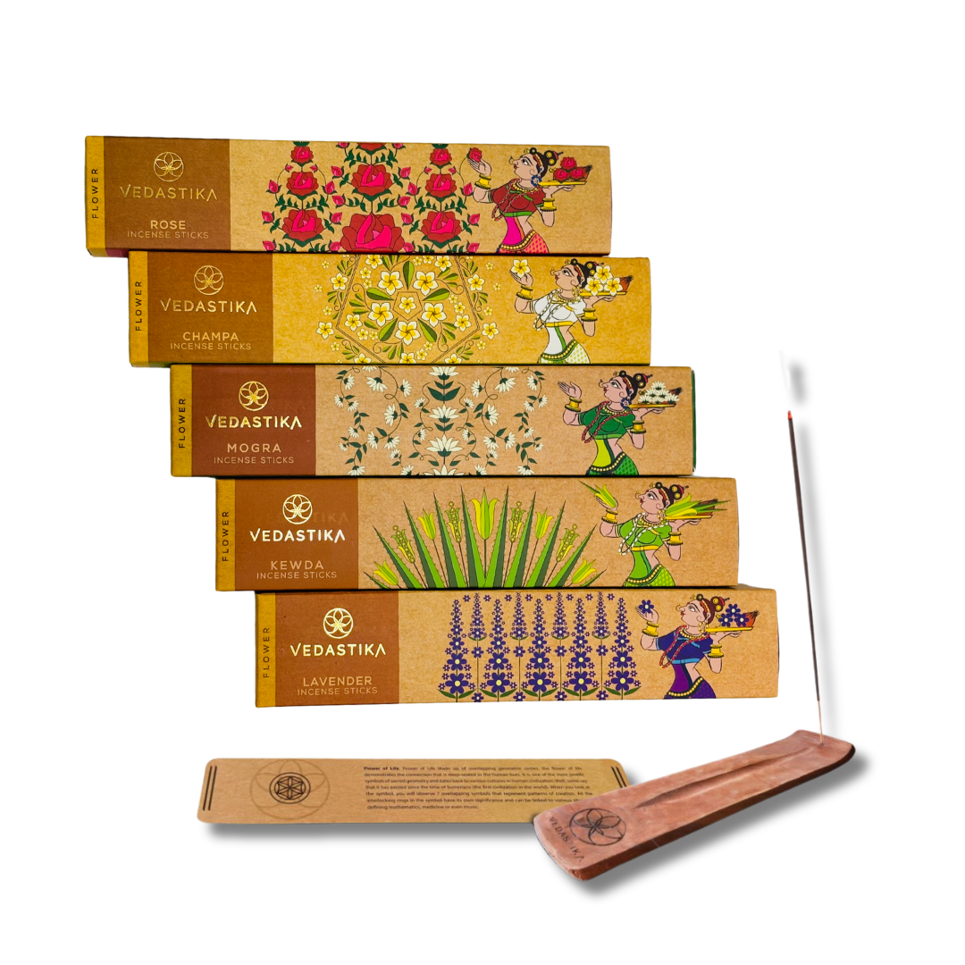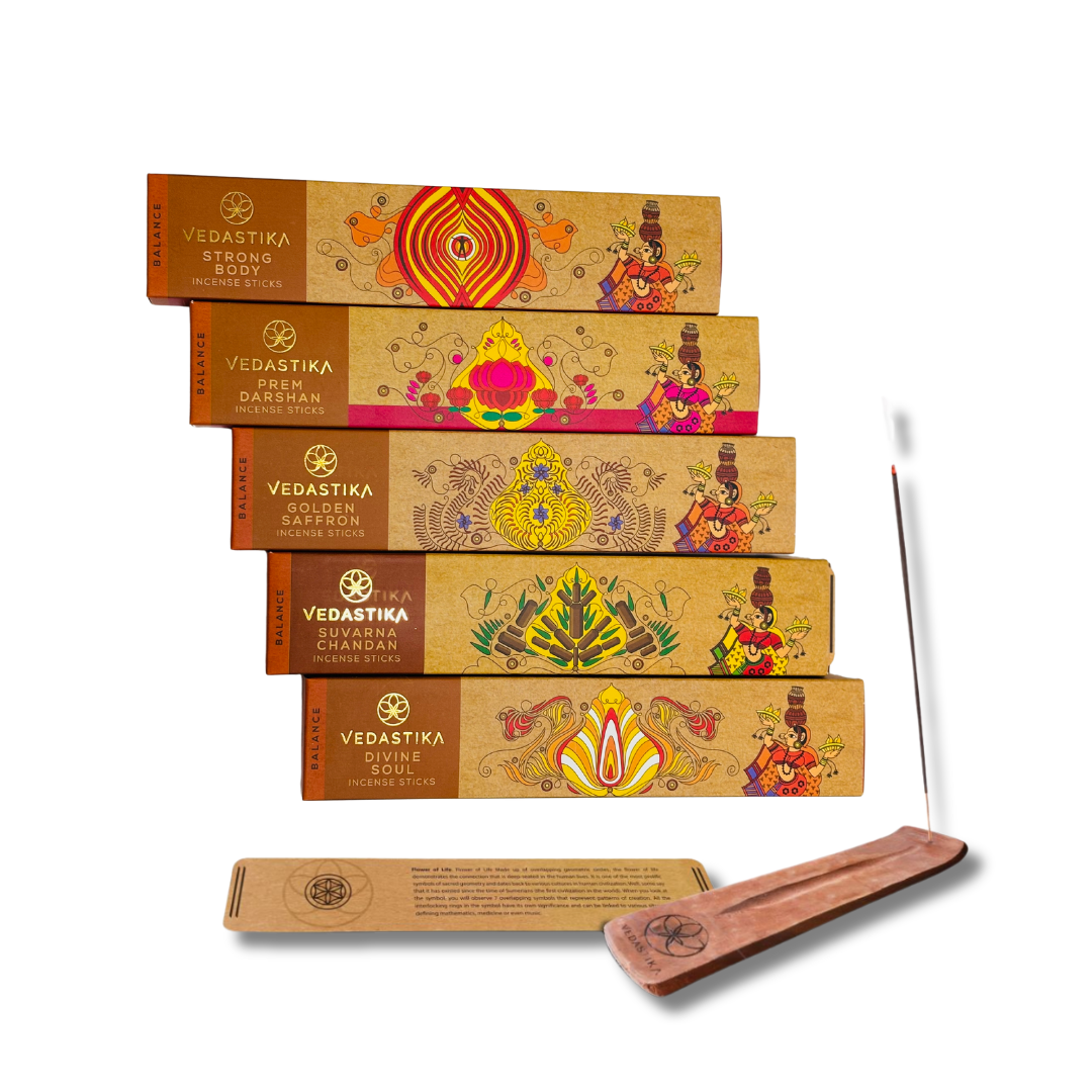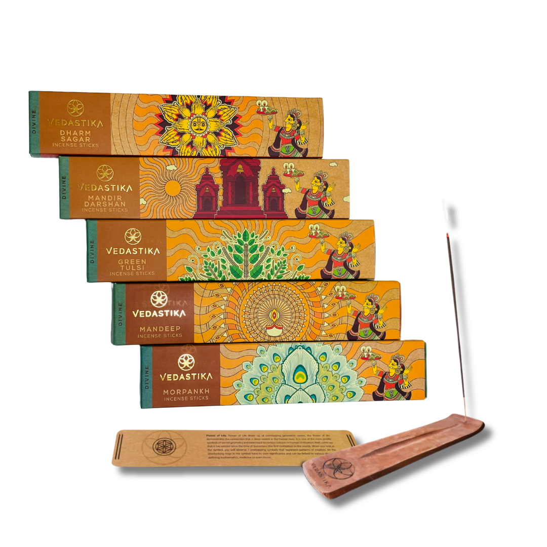1. Spiritual Connection: The incense sticks are presented as a means to connect with the spiritual world, drawing from the ancient roots and wisdom of the Vedas, which means "knowledge." The use of the Swastika symbol adds to the religious and cultural significance.