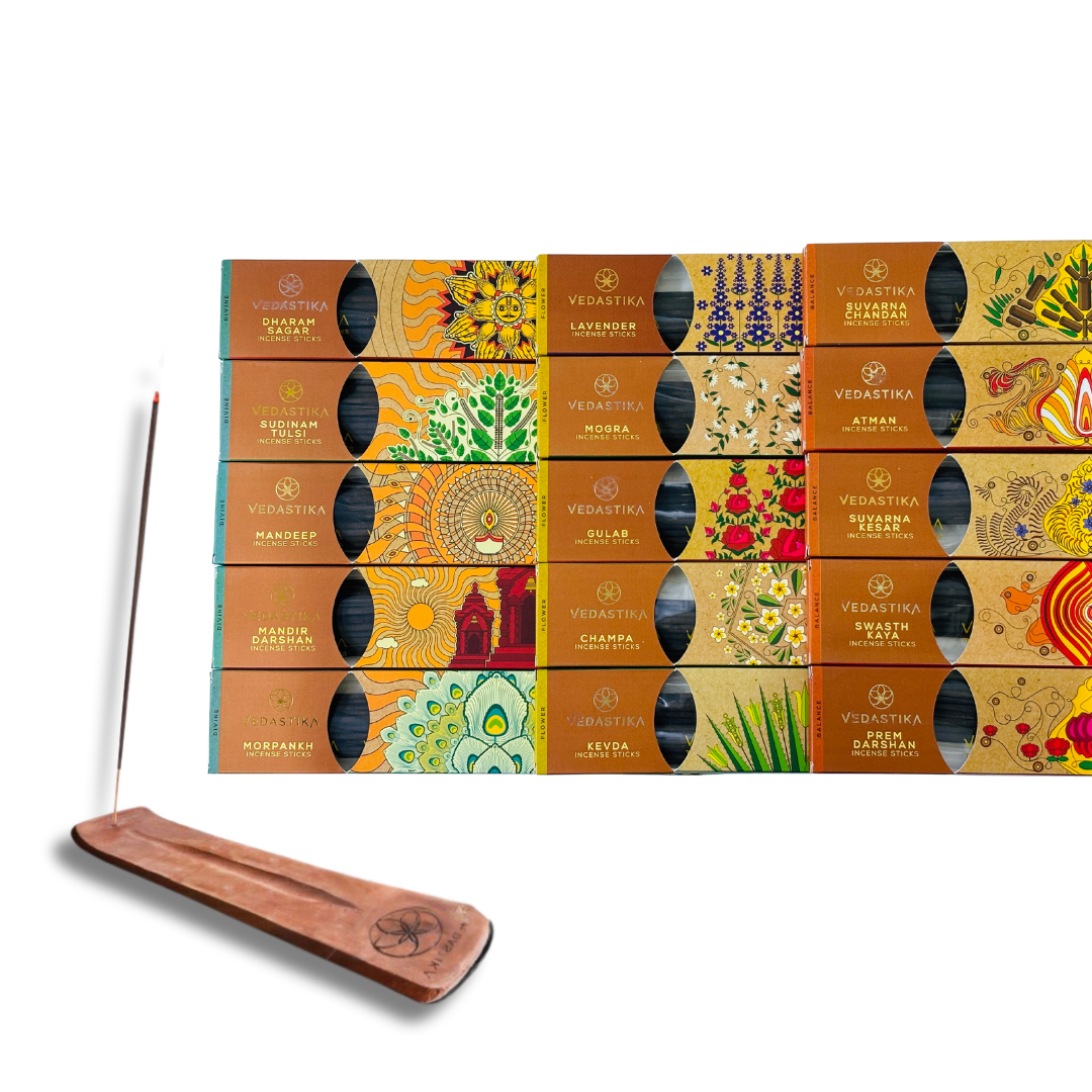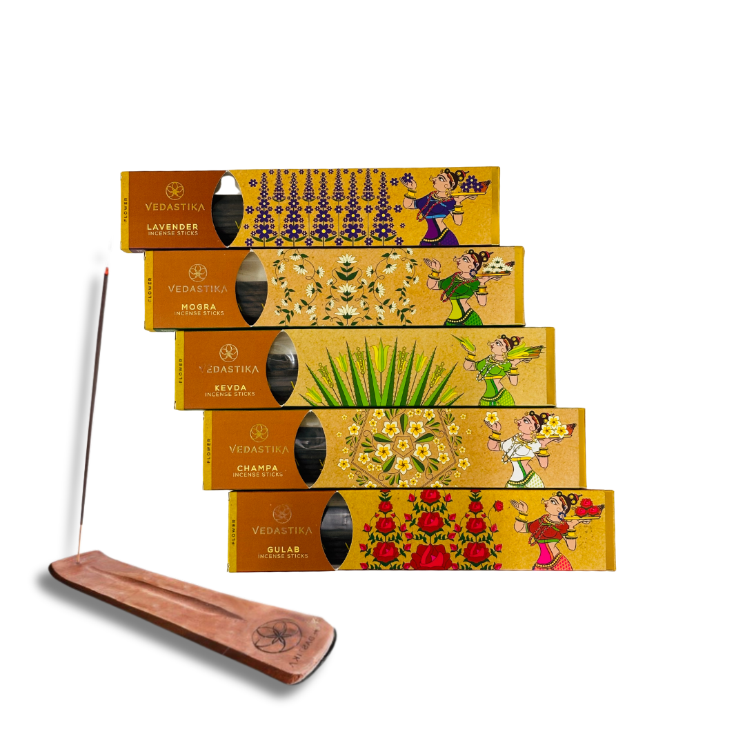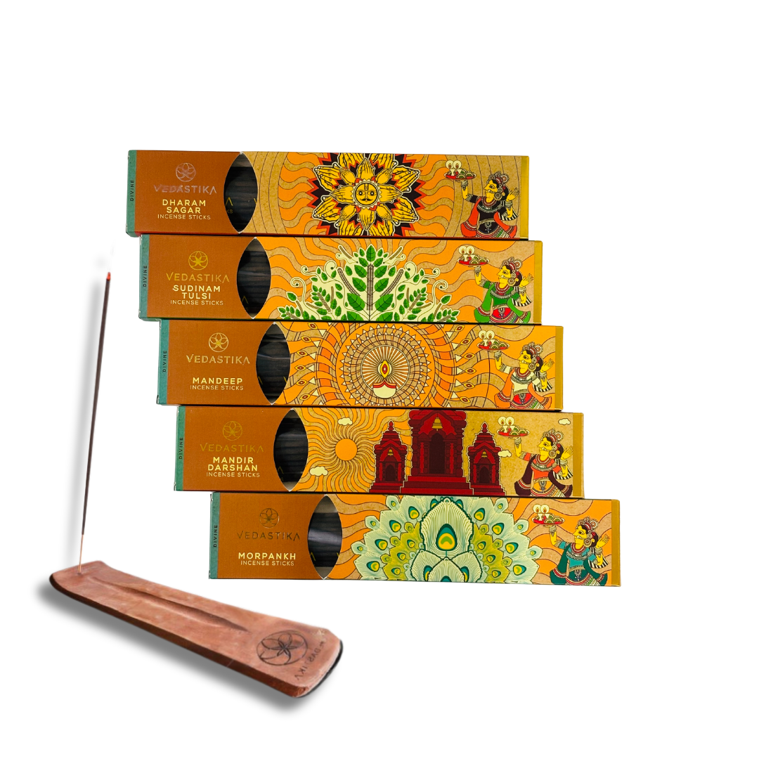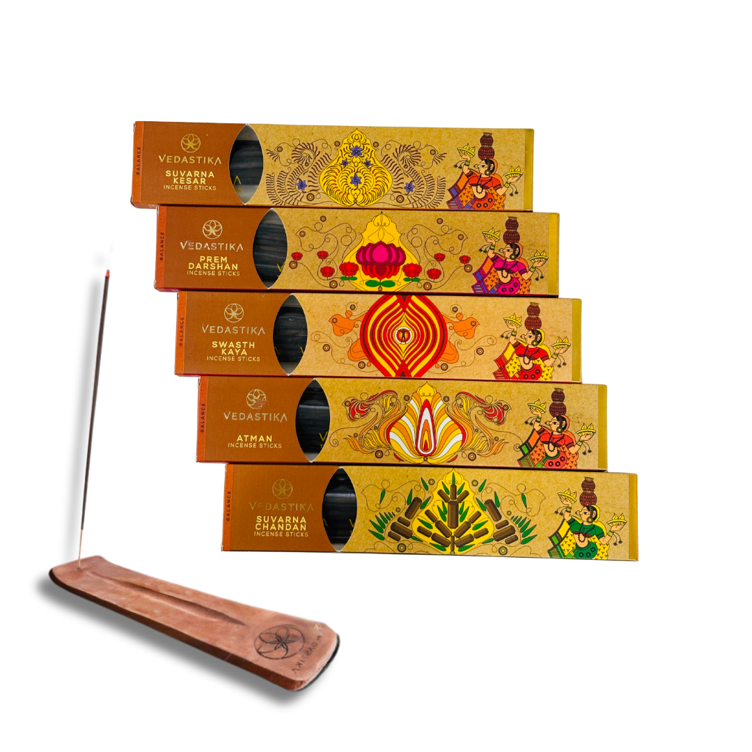 1. Spiritual Connection: The incense sticks are presented as a means to connect with the spiritual world, drawing from the ancient roots and wisdom of the Vedas, which means "knowledge." The use of the Swastika symbol adds to the religious and cultural significance.